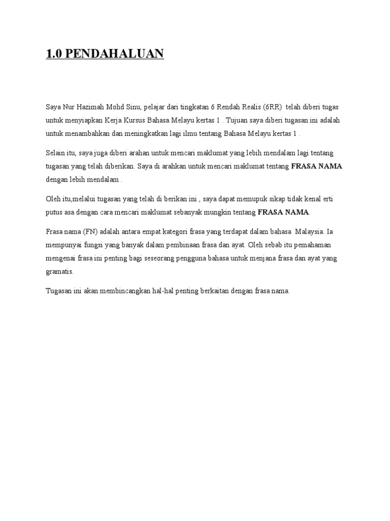. Frasa nama menurut Nik Safiah Karim er al. Dibagian pertama kita akan membahas apa itu pengertian dan ciri frasa terlebih dahulu kemudian kita lanjutkan pada bagian kedua yang membahas macam- jenis dari frasa yang disertai juga dengan contoh frasa tersebut. 1993556 ialah frasa yang perkataan utamanya terdiri daripada kata nama kata nama terbitan atau kata ganti nama.
