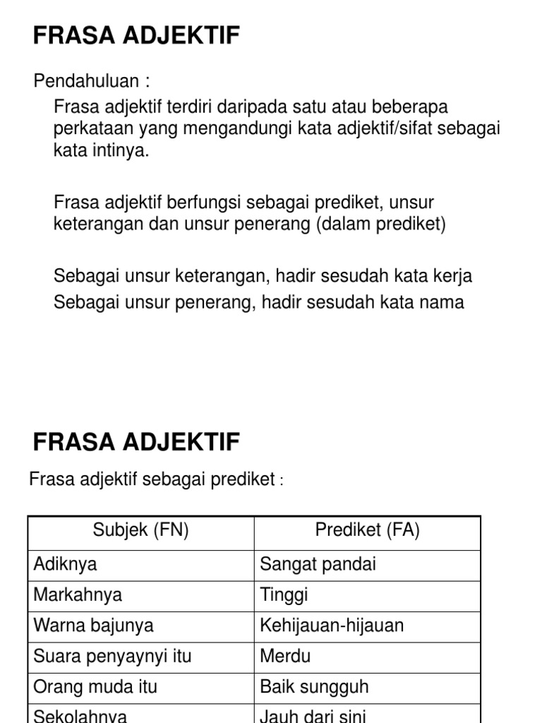 Contohnya Aku anok kappu aku anak kampung Kata Ganti Nama. Dalam tatabahasa frasa ialah binaan yang boleh terdiri daripada satu patah kata atau rentetan beberapa patah kata yang berfungsi sebagai konstituen dalam ayat sama ada sebagai subjek predikat objek atau keteranganFrasa tiada subjek dan predikat. Apa itu Frasa Adjektif 4.