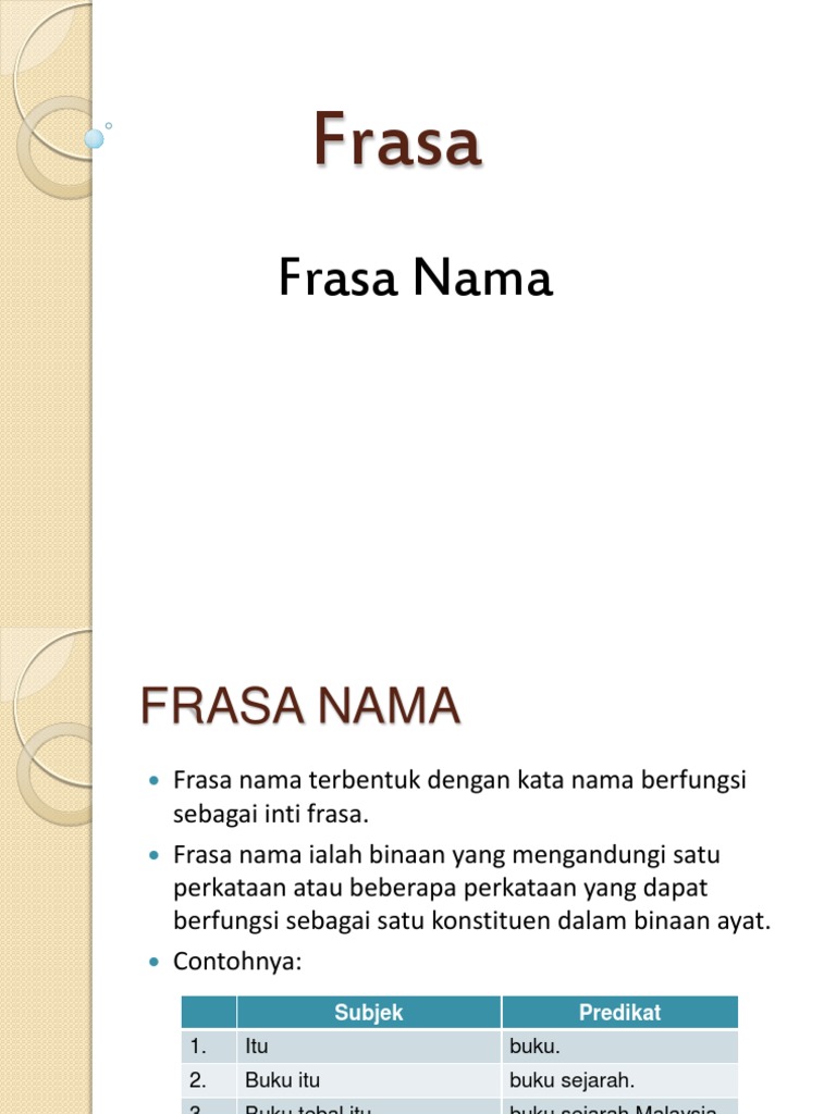 - Frasa nama subjek boleh terdiri daripada kata nama am kata nama khas kata nama. A Budak itu kurus seperti galah. Frasa sendi nama keterangan frasa adjektif 1Frasa jenis ini dapat antara lain mendukung makna keterangan bandingan hal masa dan tujuan.